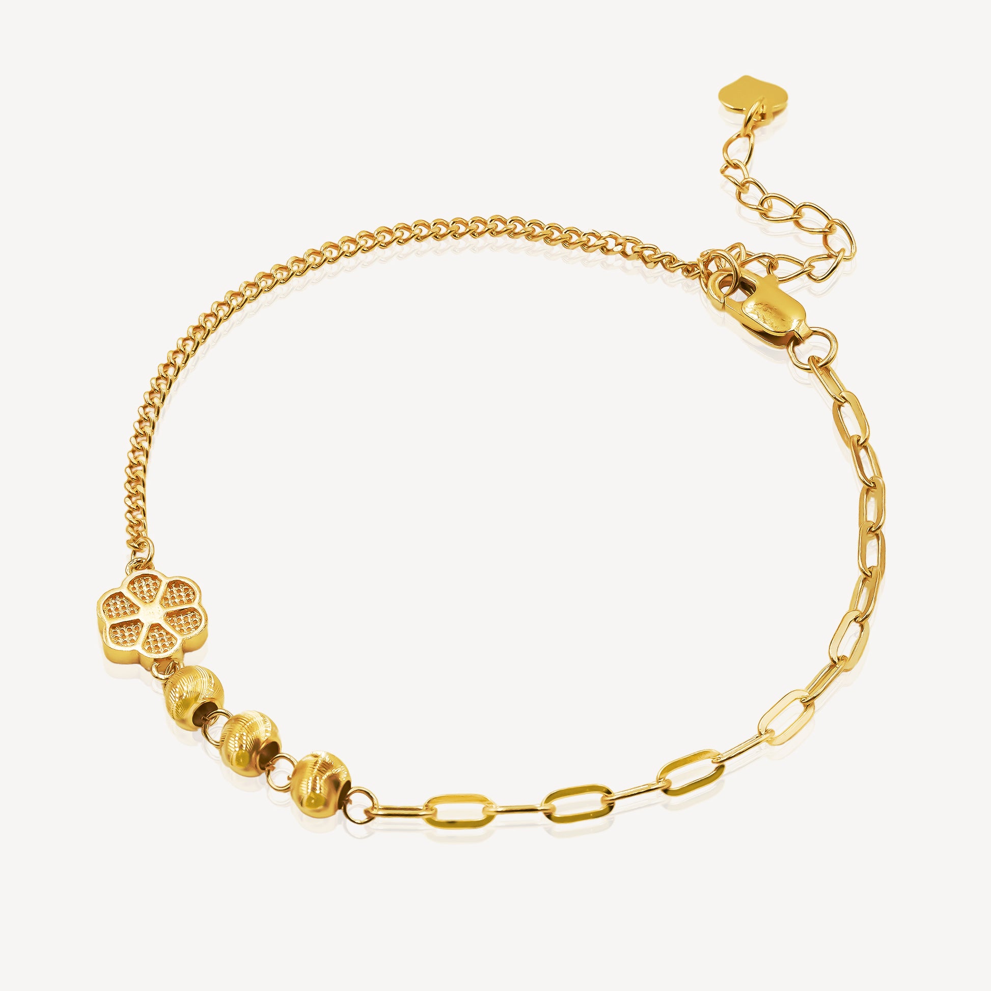 This 916 Gold Charmed Harmony Bracelet boasts a high-quality and luxurious design, crafted with 916 gold. It radiates elegance and sophistication, making it a perfect accessory for any outfit. Its stunning design promotes harmony and balance, evoking a sense of calm and well-being. Elevate your style with this exquisite piece.